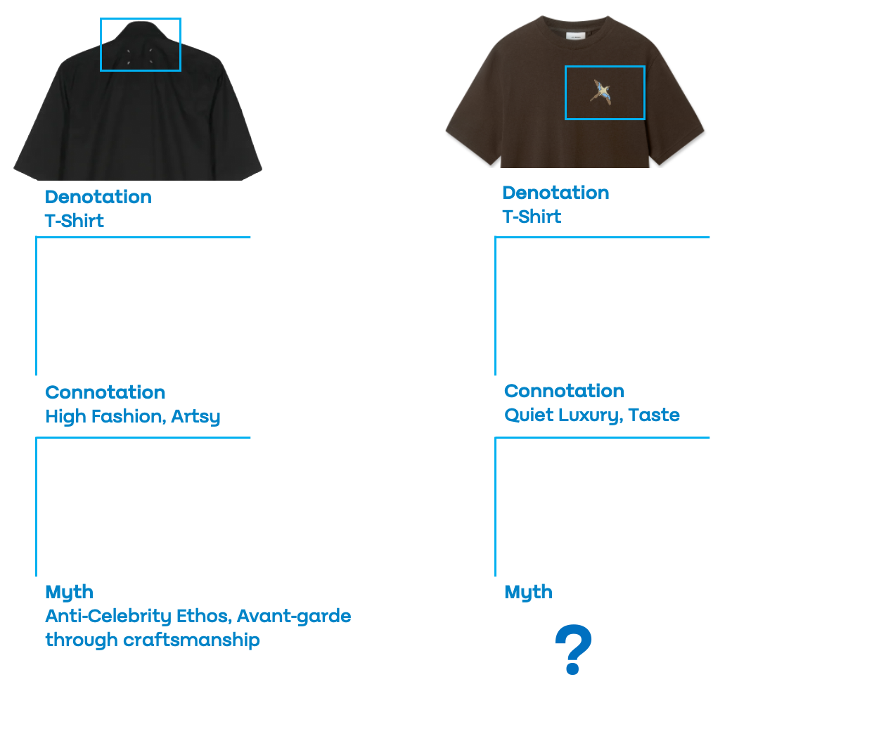 Barthes divides the meaning of objects into three levels: what they are (denotation), what we associate with them (connotation), and the deeper worldview behind them (myth).