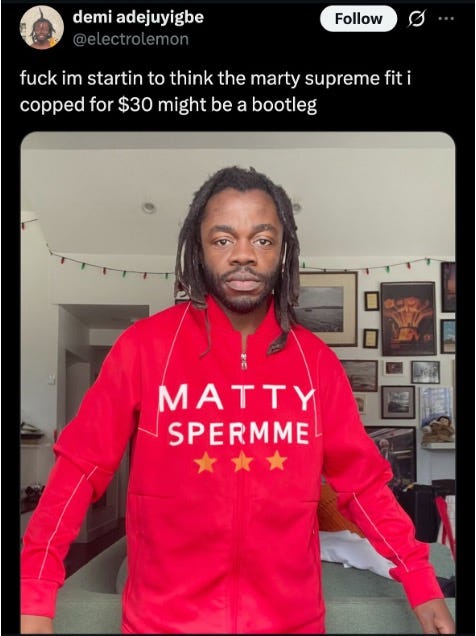 The flex itself becomes the whole message. You’re dying to get your hands on the Marty Supreme jacket a month before the film is even out (because Frank wore it!!1!).